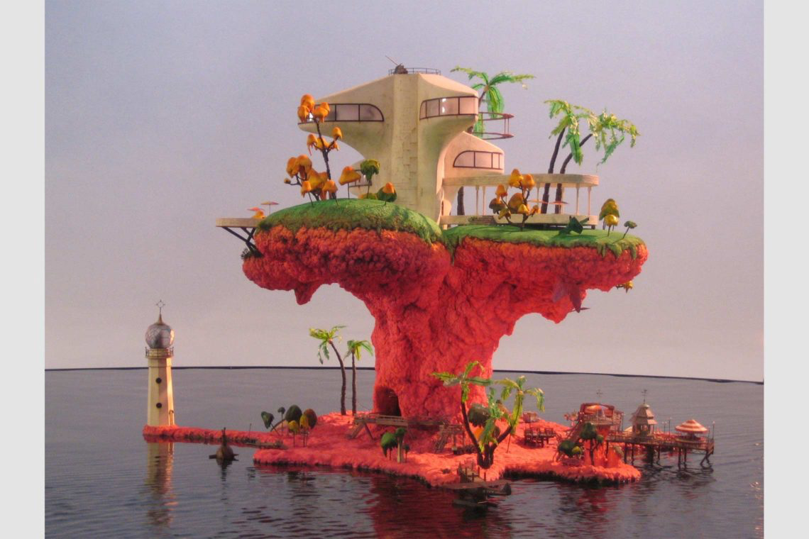 - 关于岛屿:露出洋面的部分是由砖红色的岩土构筑的一个环形平地和中央高耸的岛台。平地上散布着灯塔、棕榈树、庭院、梯子、包厢、动物残骸等物件。中央的岛台上则覆盖着绿色植被,以及一座现代风格的白色豪宅;而洋面底下则隐藏着岛屿的另一半,那里是乐队成员 2-D 的家